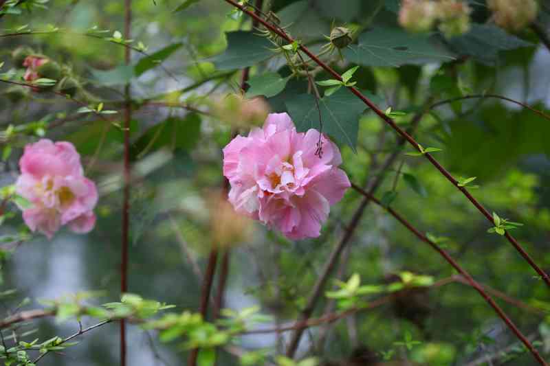 木芙蓉会出现在道路两旁,或丛植、或孤植,九曲桥旁、戏鹅池畔。精巧的红、灵动的粉、灿烂的黄在墨绿的叶色映衬下,美丽的让人挪不开眼,只是这样的美丽朝开夕落,甚是可惜。 木芙蓉的花色拥有着一天三变的特性,唤作三醉芙蓉,清晨初开的洁白、午后的淡粉、傍晚时分的紫红。这善变的女神,透着一股神秘气息,需要细心发觉。