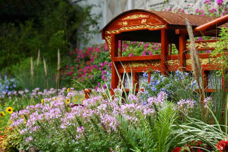醉蝶花的花瓣有4片,是从下向上、从内向外渐次开放,并且随着时间推移由白转为红,最后呈现浪漫的粉色。最为惊艳的是跳出花瓣的“雄蕊”,就像体操运动员手里的丝带,轻盈而飘逸,就连蝴蝶也沉醉其中。古猗园醉蝶花在花坛、花境中均有应用,就在林缘下、道路旁,清幽迷人。