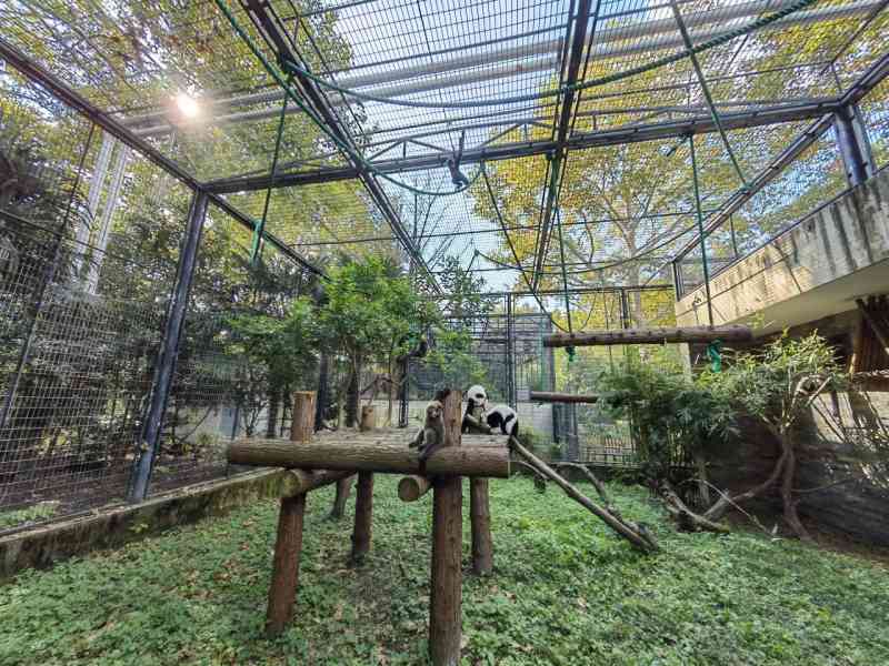 升班不久隔壁迎来了同样来自哺育室的长臂猿宝宝。这不是儿时的玩伴嘛!在他们各自适应了自己的新家生活之后,我们让他们见面啦!一开始大家还比较拘谨,后来就玩到了一起,天气好的时候大家一起出来晒晒太阳,长臂猿在高层愉快的荡漾,领狐猴在中层栖架跑跑跳跳,这种相互的“社群丰容”起到了不错的效果。