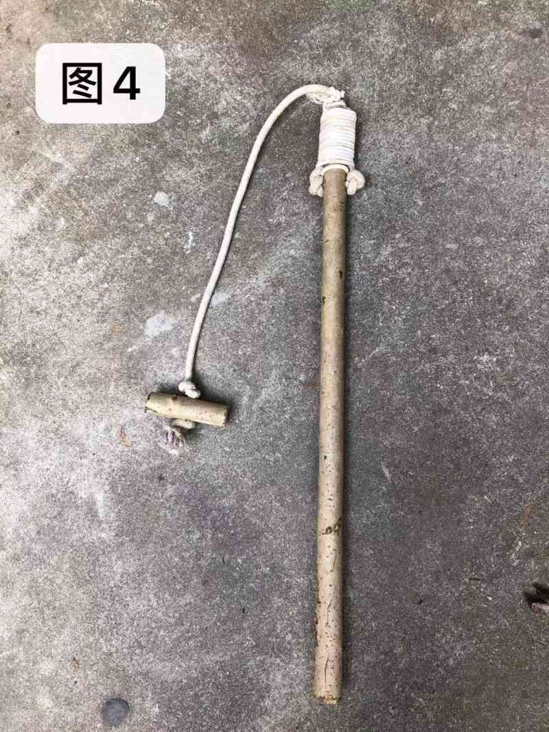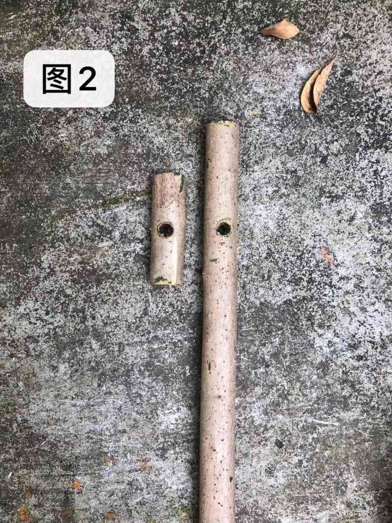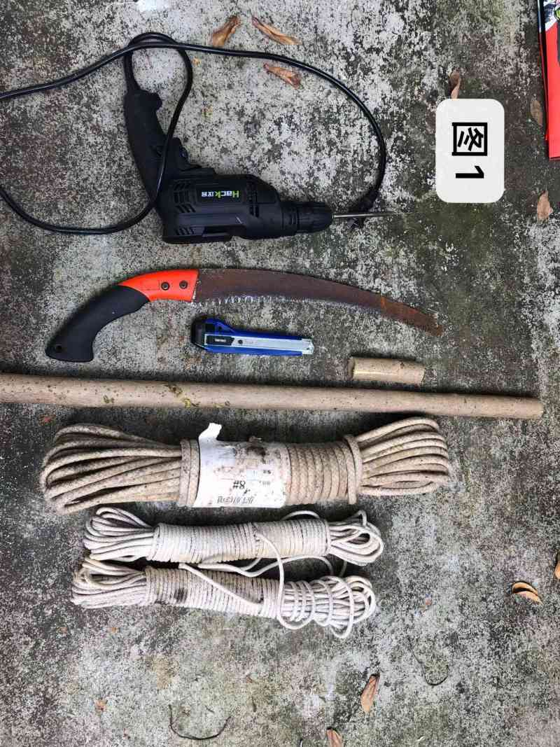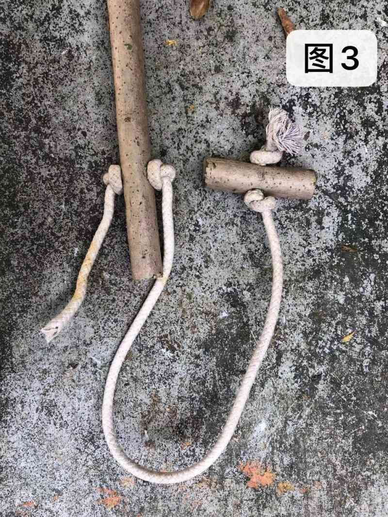 所需材料和工具如图1所示,电钻、锯子、美工刀、木棍、粗细旗杆绳。用电钻在木棍上打孔,位置如图2所示。用粗的旗杆绳系紧并打结,将一长一短两根木棍连在一起,如图3所示。最后用细的旗杆绳收口,固定住衔接部位即可,如图4所示。
