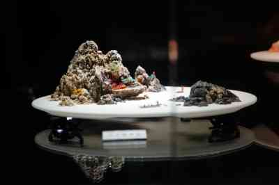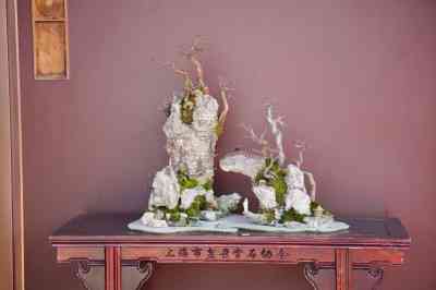 山石盆景选盆应从山石材料的软硬、枯润、大小、颜色、风格、形态等考虑,与景物相辅相成。正圆盆、正方盆等适用于主峰高耸的奇石怪峰近景造型,更易衬托出山的奇特,给人高耸挺拔、庄严的感觉;长方盆给人平静、开阔之感,适用于布置远景山水,山高水阔,前后景深“意远”,有飘渺之感,能加强构图的长度与深度,增强作品的表现力;做工精巧的盆适用于细腻之石的造型;做工粗犷的盆适用于布置高大有力度的山石造型;直角边盆适用于刚性造型,以显示力量;椭圆盆适用于圆山秀丽的造型,其线条柔和,与景物吻合呼应。